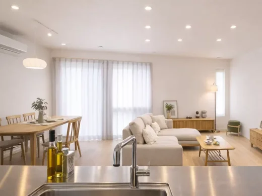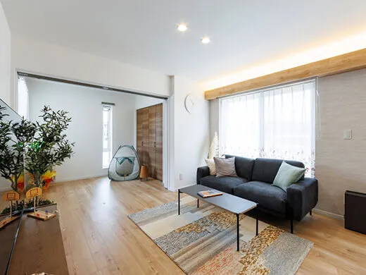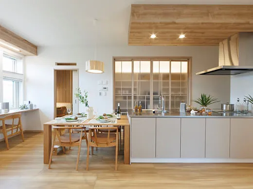 ゆったりとくつろげる19帖の広々LDK。対面式キッチンからリビング全体を見渡せるため、お料理をしながら家族との時間も楽しめます。視線が抜けることで、空間を開放的に感じられる設計です。