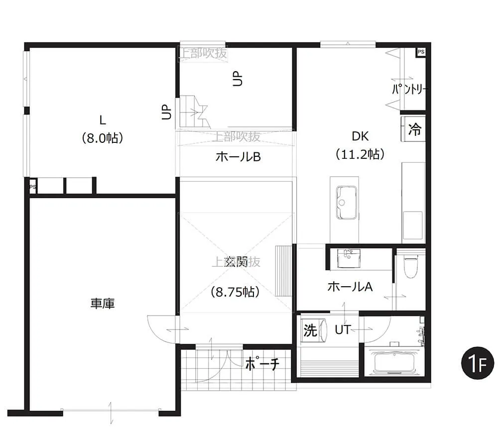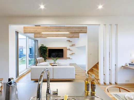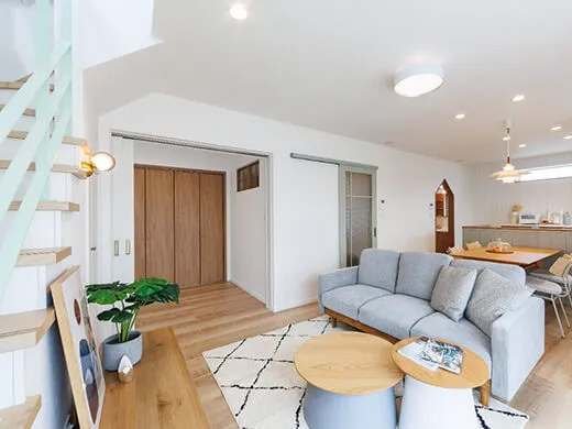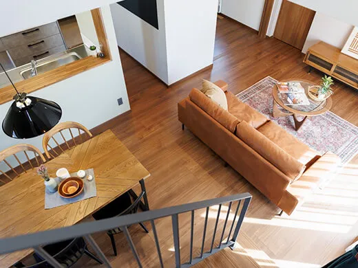 キッチンダイニングとゆるやかにゾーニングしたリビング。吹き抜けからやわらかな光が差し込み、開放感と心地よさに包まれます。リビングフロア下は収納スペースとして無駄なく活用できます。