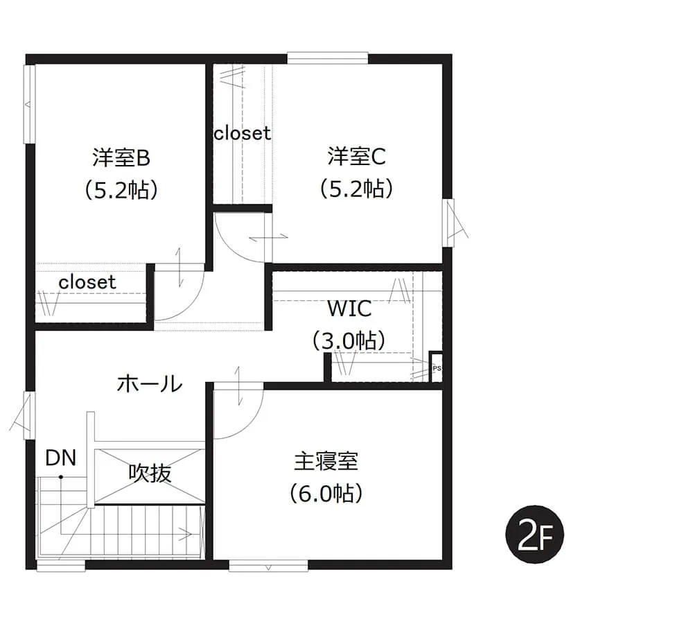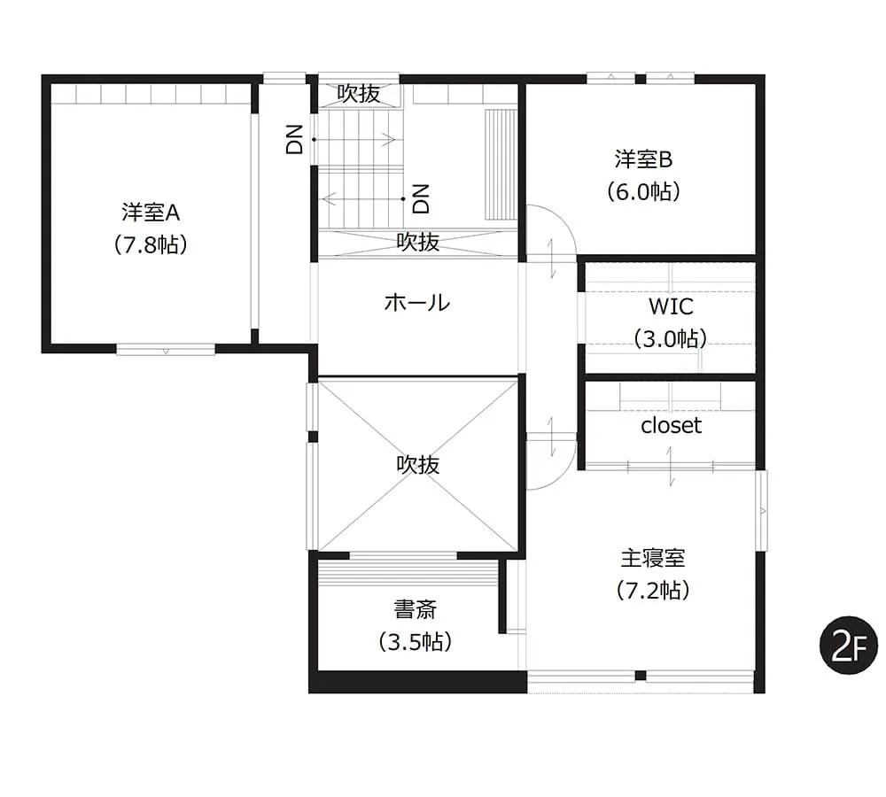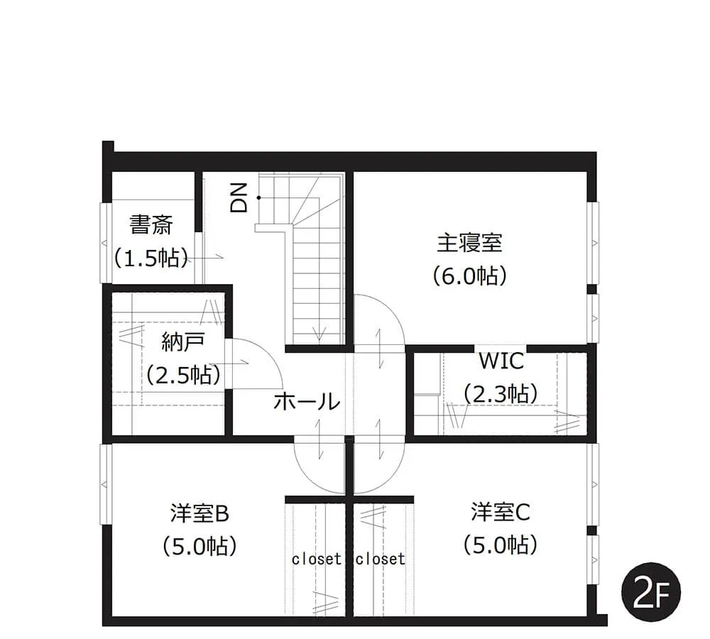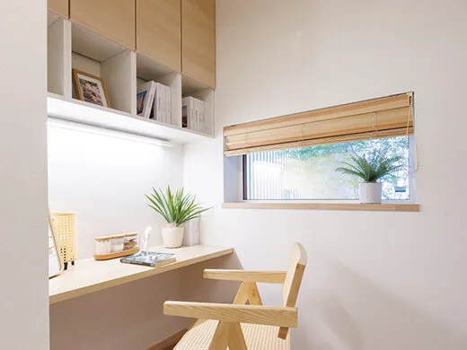 家族それぞれの個室としてはもちろん、ゲストルームや将来は平屋のような暮らしにも対応。さらに書斎も備え、ライフスタイルの変化に柔軟に対応できる間取りです。