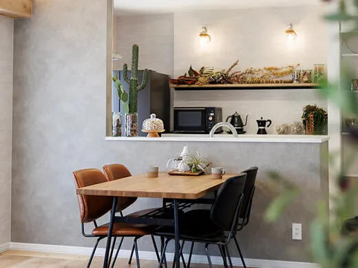 L字型キッチンはカウンター付きで、そのまま食事を楽しんだり、友人を招いてホームパーティーを開いたりと大活躍。冷蔵庫も収まるパントリーを備え、生活感を抑えながら見た目もすっきり整います。