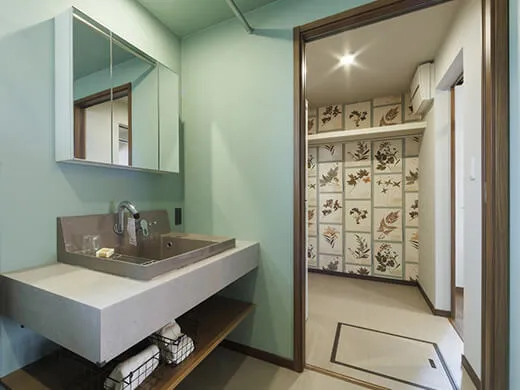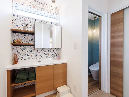 洗面台はオープン収納の造作風デザインで、幅180cmのゆとりあるサイズ。朝の忙しい時間も快適に身支度できます。脱衣室と分けているため、家族の入浴中や来客時も気兼ねなく利用できます。
