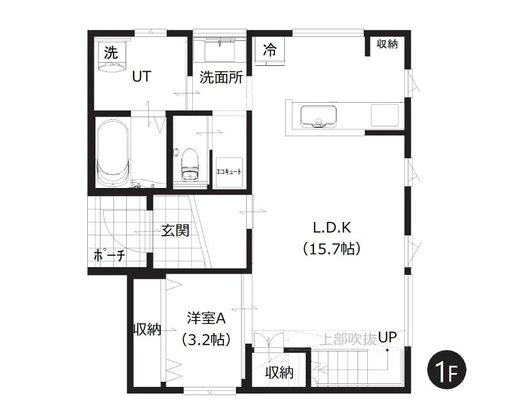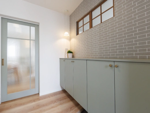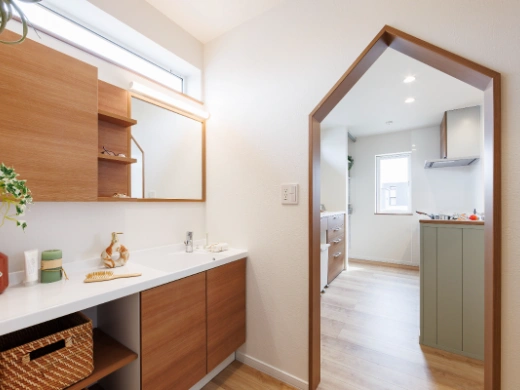 玄関から洗面、ユーティリティ、LDKへとつながる回遊動線を採用。帰宅後の手洗いや家事もスムーズに行え、暮らしやすさと快適性を高めています。