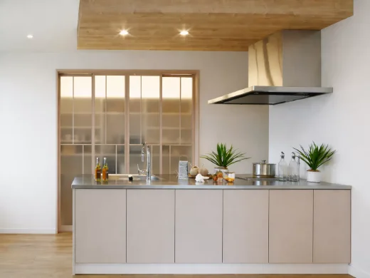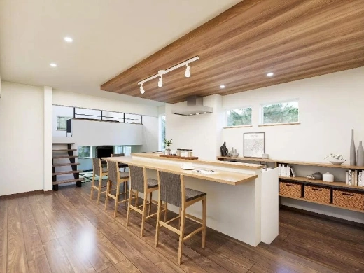下がり天井を採用し、空間にアクセントをプラス。背面収納や階段下のパントリーを備え、すっきりと整ったキッチン空間を保てます。
