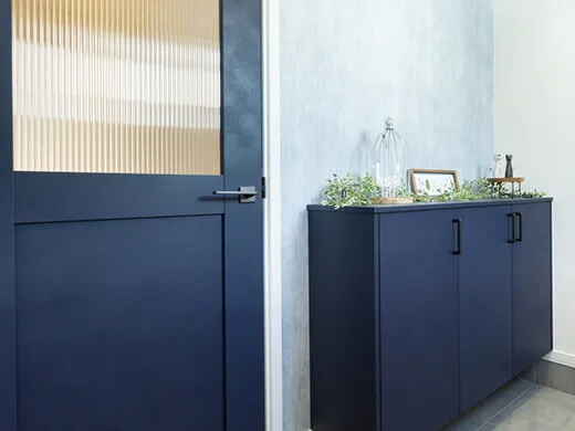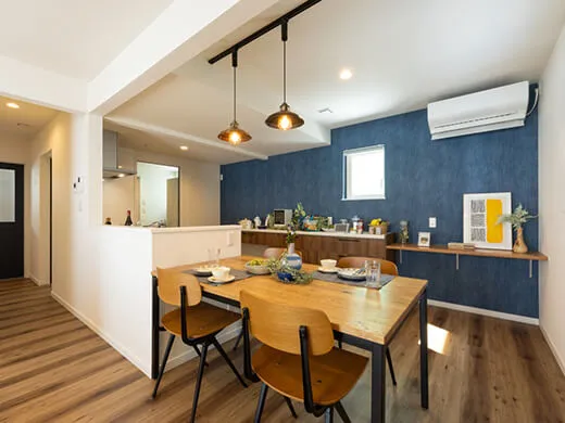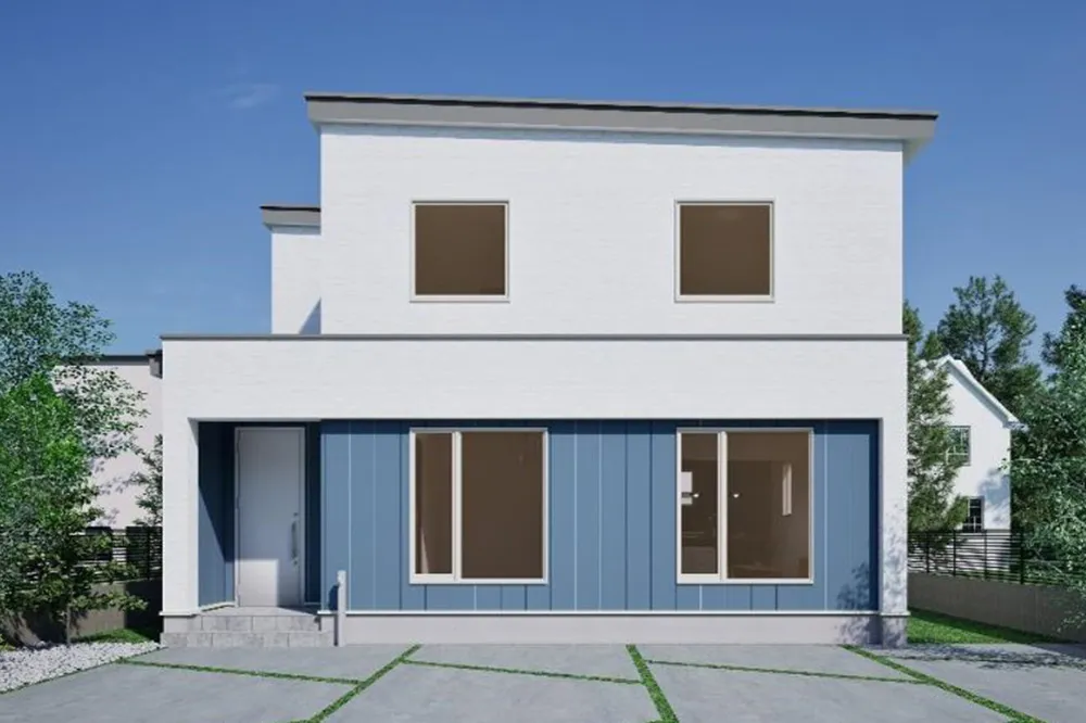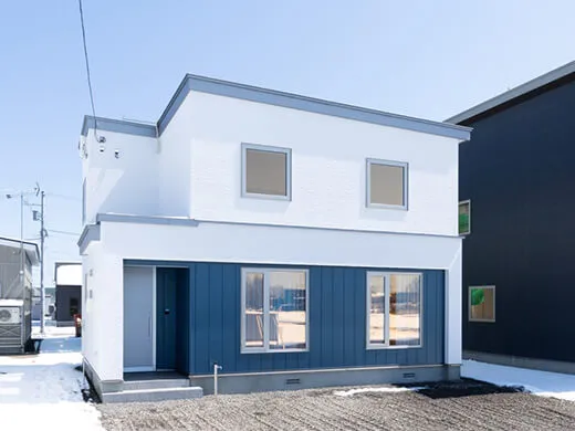 ホワイトを中心にシンプルな張り分けを採用。ブルーのガルバリウムが引き立ち、外観に印象的なアクセントを与えます。