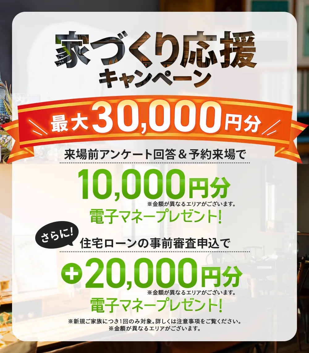 家づくり応援キャンペーン!前日までの予約見学&アンケート回答で最大5,000円分の電子マネープレゼント! 家づくり応援キャンペーン!前日までの予約見学&アンケート回答で最大5,000円分の電子マネープレゼント!