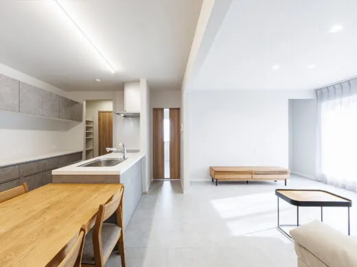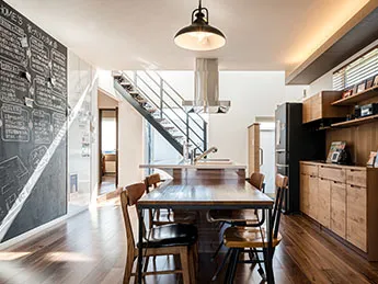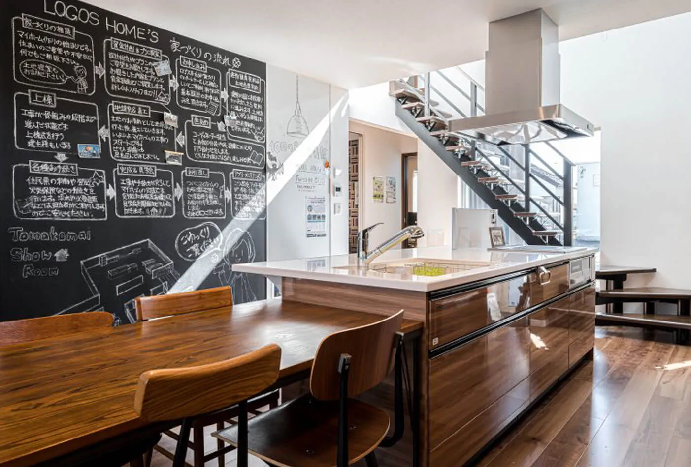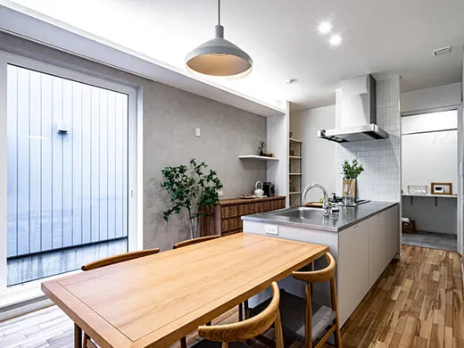 ステンレス天板と内装タイルを取り入れた、デザイン性の高いペニンシュラ型キッチン。前面には収納を備え、見た目と使いやすさを両立しています。横並びのダイニングで配膳や片付けもしやすく、家族やゲストとの会話も自然と広がる、心地よい空間です。