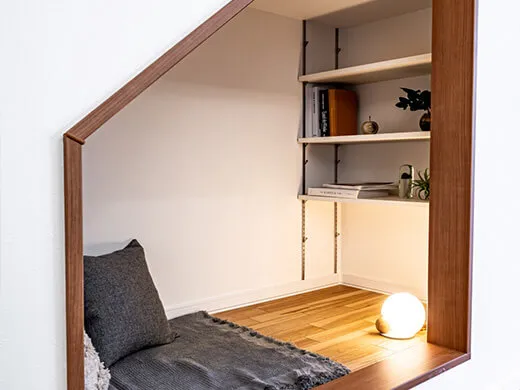 階段下のヌックは、最近人気のある空間活用アイデアのひとつです。ちょっとした”こもり感”のあるスペースで、階段下というデッドスペースになりがちな場所を実用的な空間に変えられるのが魅力です。