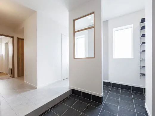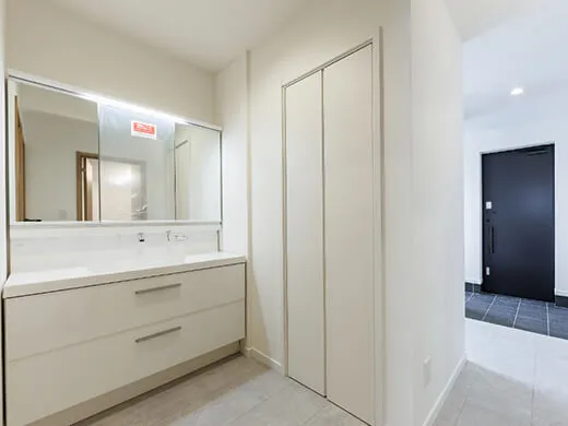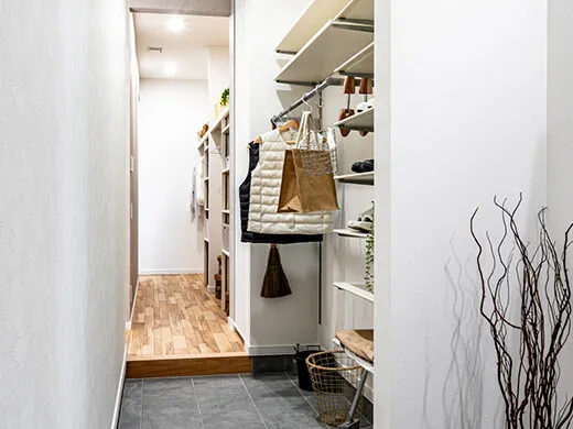 玄関から土間収納、ファミリークローゼットへと一直線につながる設計で、視線が抜けて空間も広々。回遊性のある家事動線で移動がラクになり、靴やアウター、日用品も自然に片付いて、家族みんなの暮らしにゆとりが生まれます。