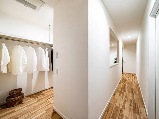 3.7帖の大容量ウォークインクローゼットを2階に配置。洋服だけでなく、バッグやシューズ、アクセサリーまでしっかり収納できます。お気に入りのアイテムを見渡せる自分だけのスペースで、身支度の時間をもっと心弾むひとときに。