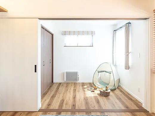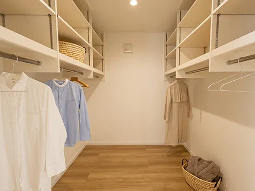 主寝室には、4帖の大容量ウォークインクローゼットを完備。衣類はもちろん、季節のアイテムもすっきり収納でき、整理整頓しやすく、いつでもすっきりとした空間を保てます。