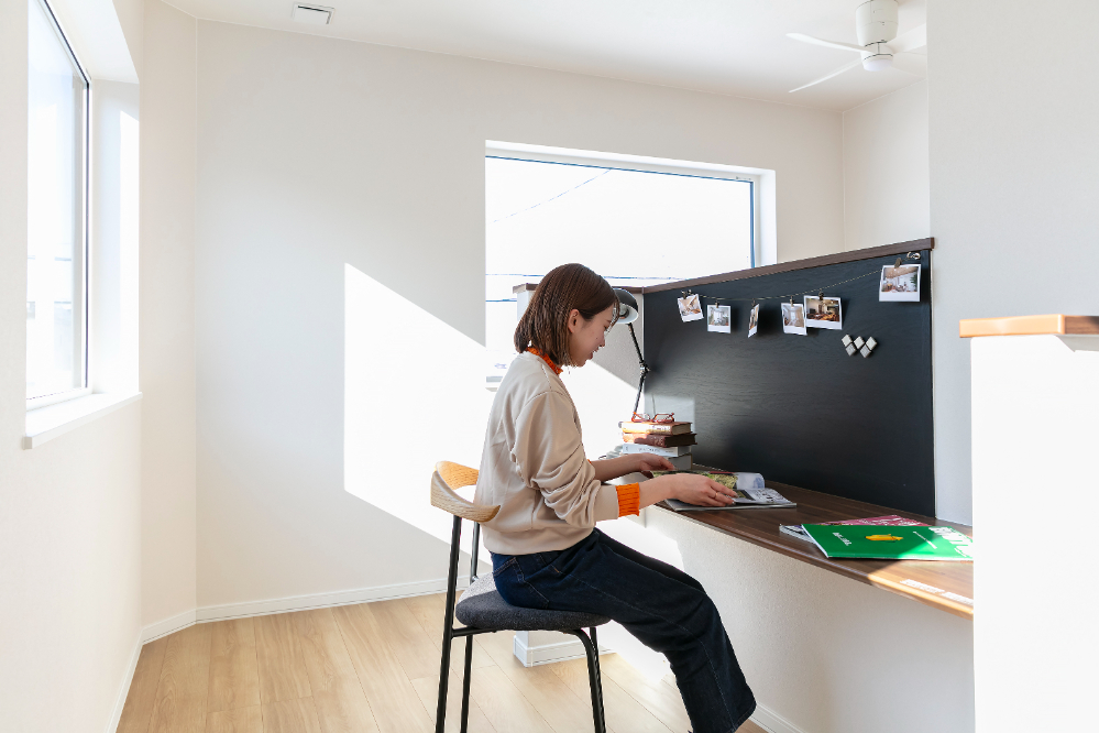 リビングの一角に作る書斎は、家族の気配を感じながらも、自分の作業に集中したい方におすすめです。空間を緩やかに区切る「ゾーニング」がポイントになります。