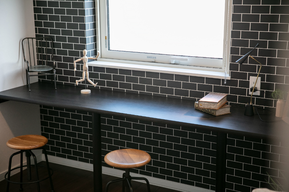 - 壁の一面にレンガやコンクリート調のアクセントクロスを貼ると、一気に雰囲気が高まります。
