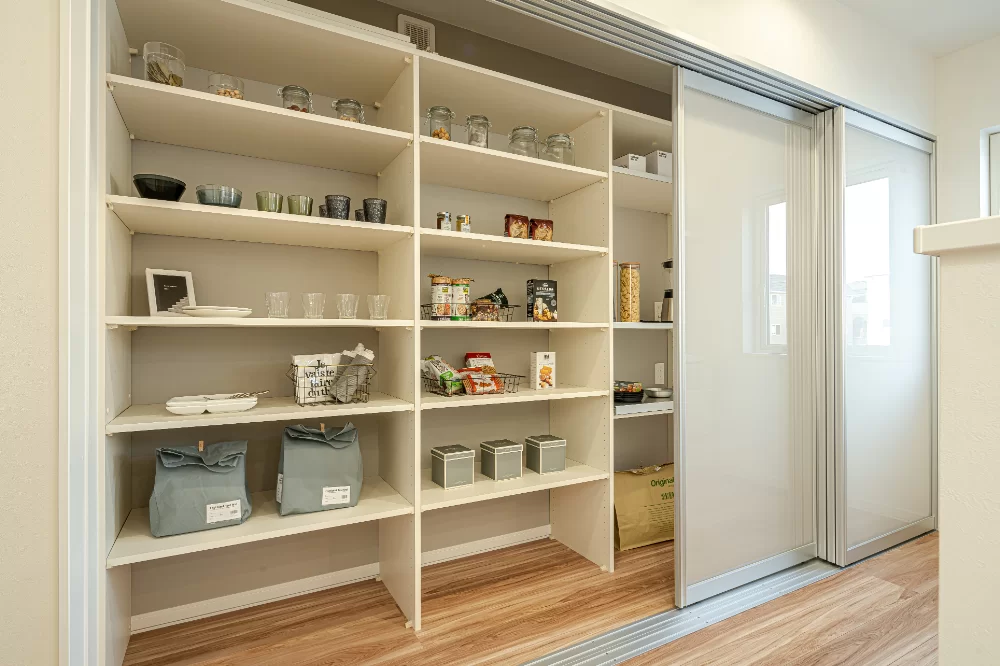 玄関横に設けることで、靴だけでなくベビーカーやアウトドア用品も収納でき、玄関を常にきれいに保てます。 - パントリー