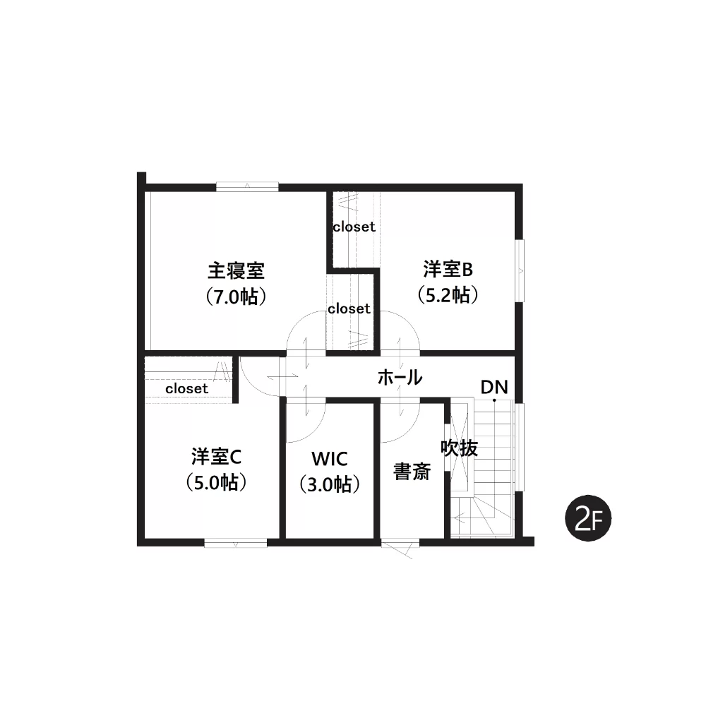 1階にキッチン・洗面室・脱衣室・ファミリークローゼットを集中させ、ぐるりと回れる回遊動線を採用。LDKは一体感のある空間にし、リビング階段で視線の抜けを作ることで、実際の面積以上の広がりを感じさせます。2階には主寝室と、子ども部屋2つの他、書斎を配置します。