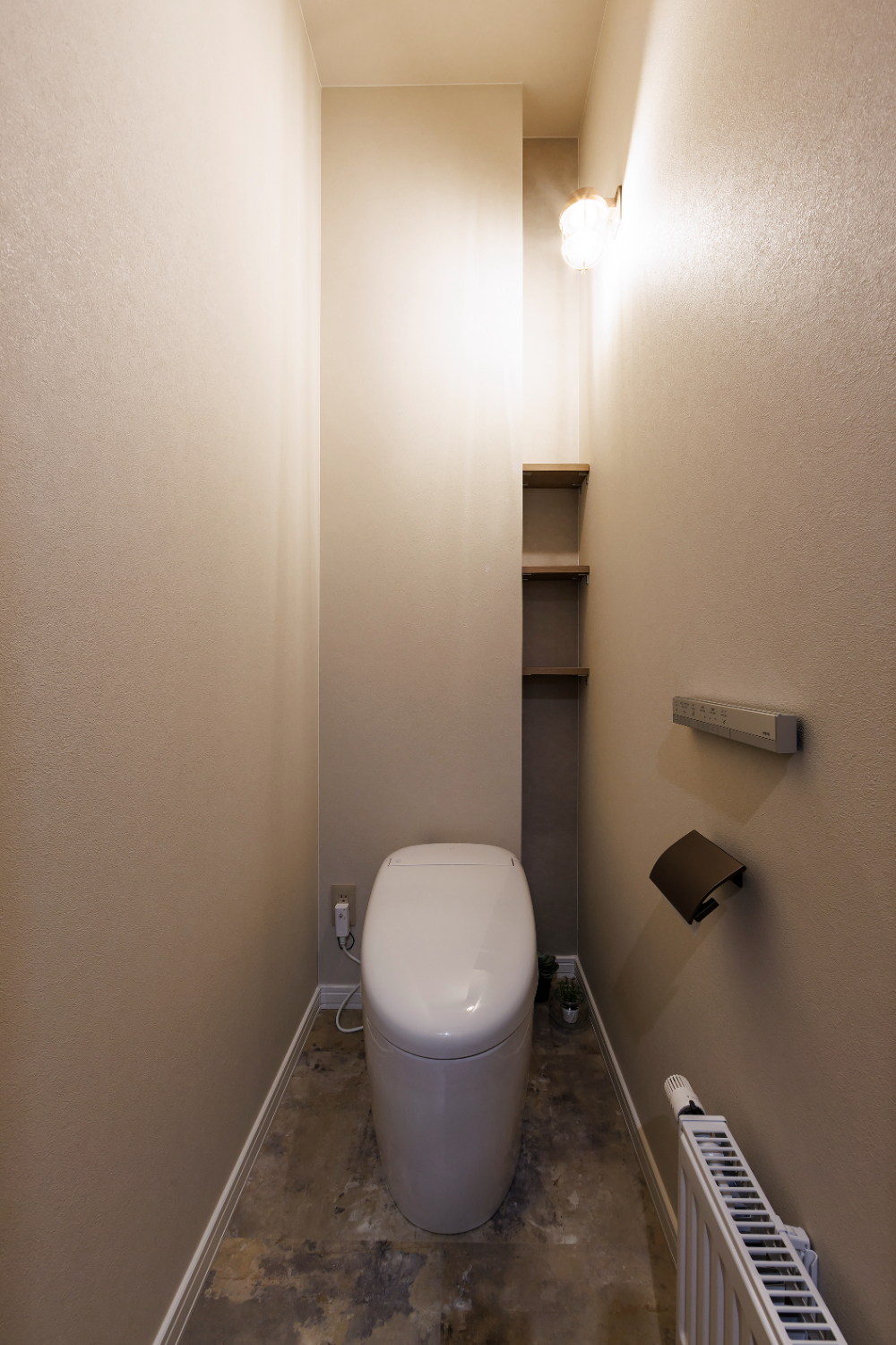 凹凸の少ないタンクレストイレや壁付けの収納を選ぶと、スッキリとした印象を保てます。 - 色使い