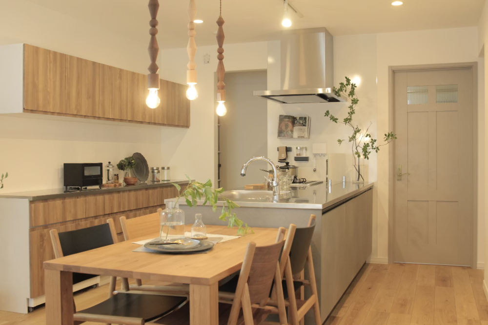 使いやすさとデザイン性を両立させた、一般的な広さのキッチンの実例です。レイアウトの選択肢も広がり、より自分らしいキッチンを実現できます。