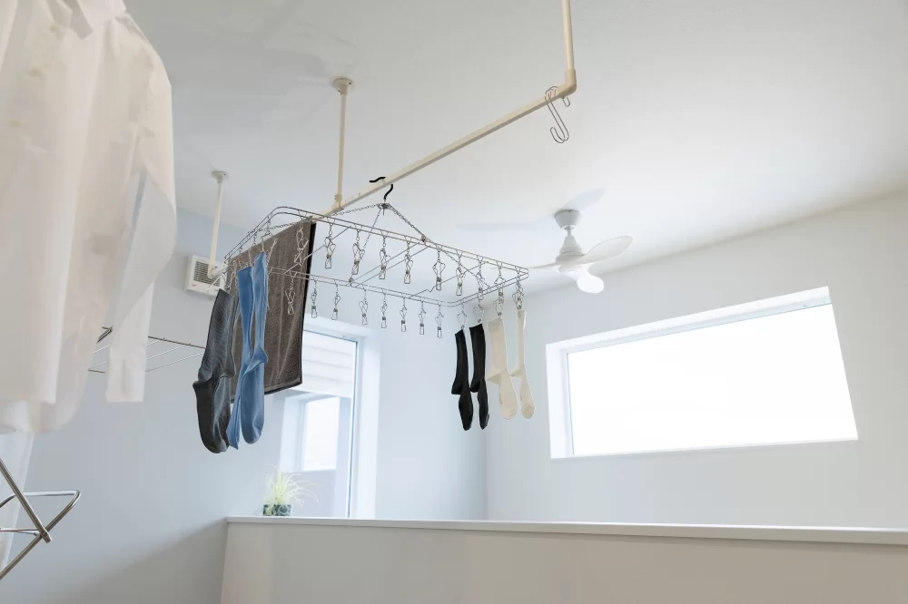 室内干しが基本になるため、天気や花粉、PM2.5などを気にせずいつでも洗濯できます。夜間に洗濯を済ませたい共働き家庭や、防犯上外に干したくない方にとっても大きな安心材料です。 - 生活感を隠し、LDKがすっきりする