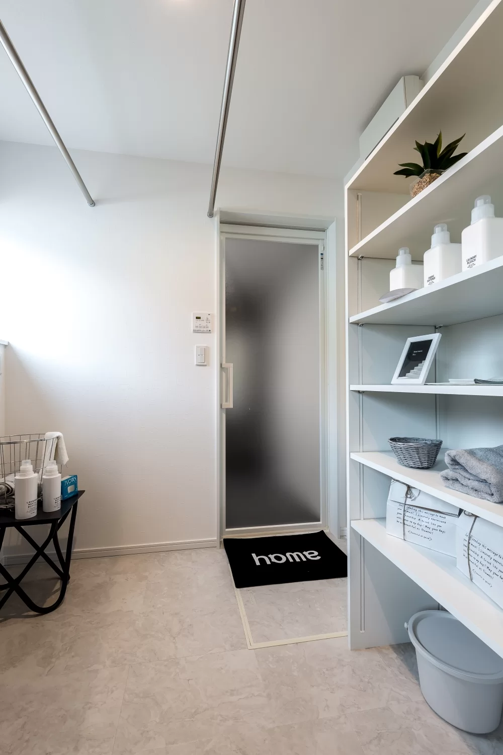 洗面脱衣所に室内干しや収納の機能を持たせた、最も省スペースなプランです。