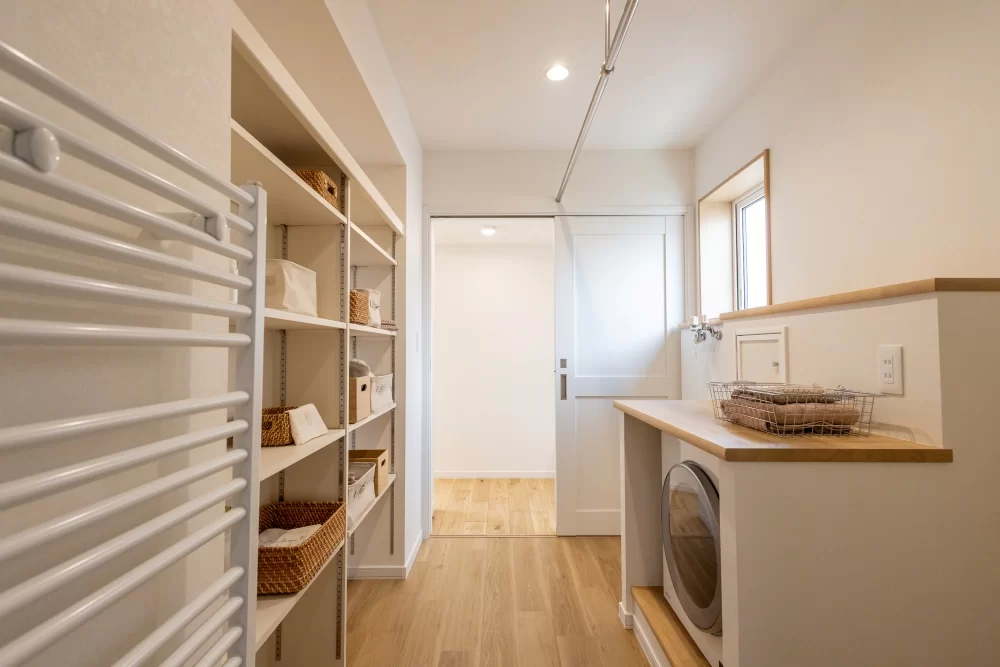 洗濯家事の最大のストレスは、作業場所がバラバラなこと。ランドリールームがあれば、「洗う→干す→畳む→しまう」という一連の流れがその場で完結します。重い洗濯カゴを持って家の中を移動する必要がなくなり、家事の負担が大幅に軽減され、貴重な時間を生み出します。 - 天候や時間を気にせず洗濯できる