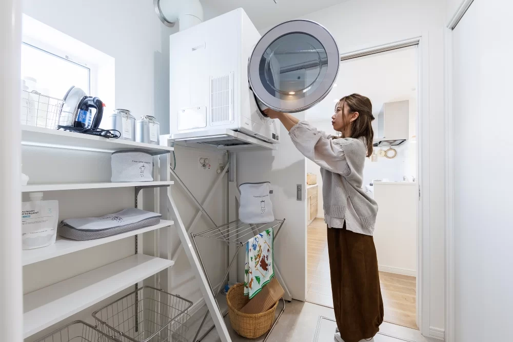 具体的には、「洗う(洗濯機)」「干す(室内干しスペース)」「乾かす(衣類乾燥機)」「畳む・アイロンがけをする(作業台)」「しまう(収納棚)」といった機能を一つに集約した空間です。