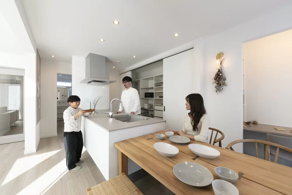 前面に壁のないフルフラットキッチンは、視線を遮らず開放感たっぷり。パントリー付きで収納力も十分、生活感を抑えたすっきりと美しい空間を実現します。