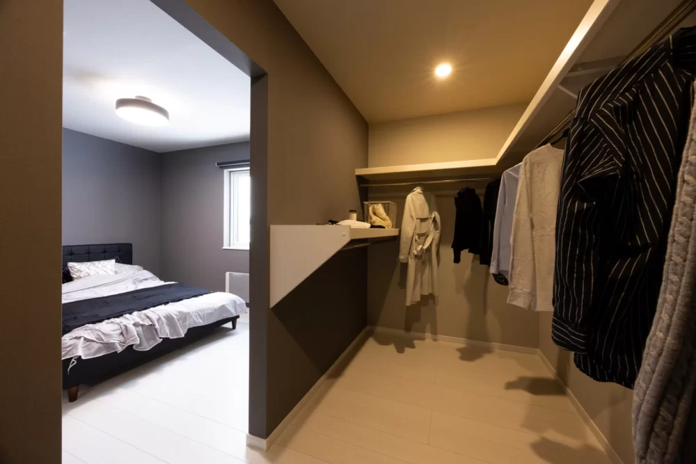 主寝室には3帖の広々としたウォークインクローゼットを設置。季節ごとの衣類や小物もすっきり整理でき、収納力も抜群です。