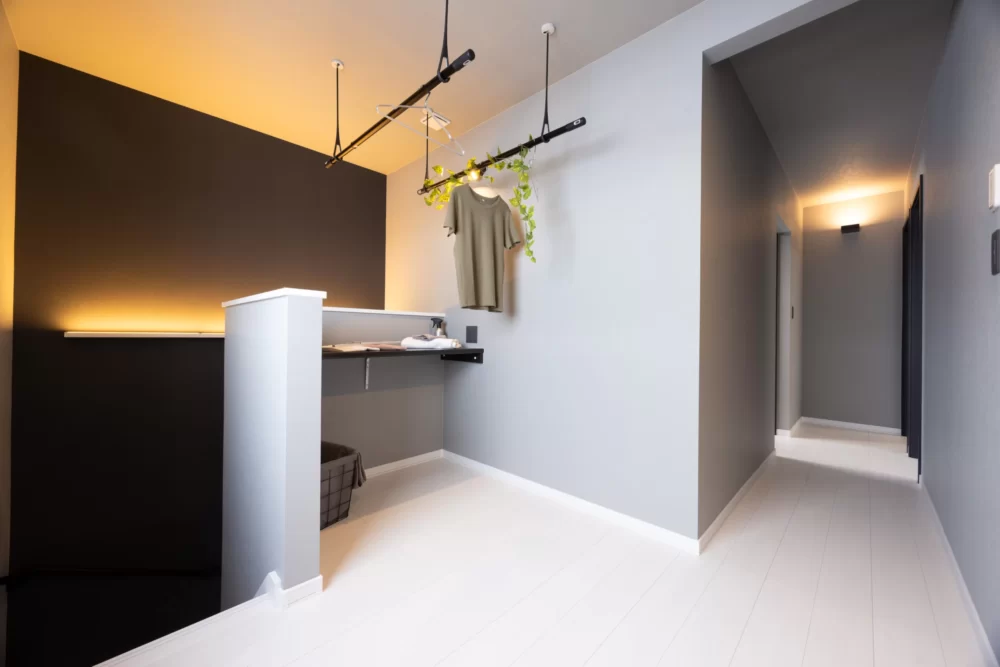 2階ホールにはカウンターと洗濯物干しを設置。通路を妨げない配置でコンパクトながら使いやすさに配慮した間取りです。書斎や趣味の作業スペースとしても活用でき、家事と趣味を両立できる便利な空間です。