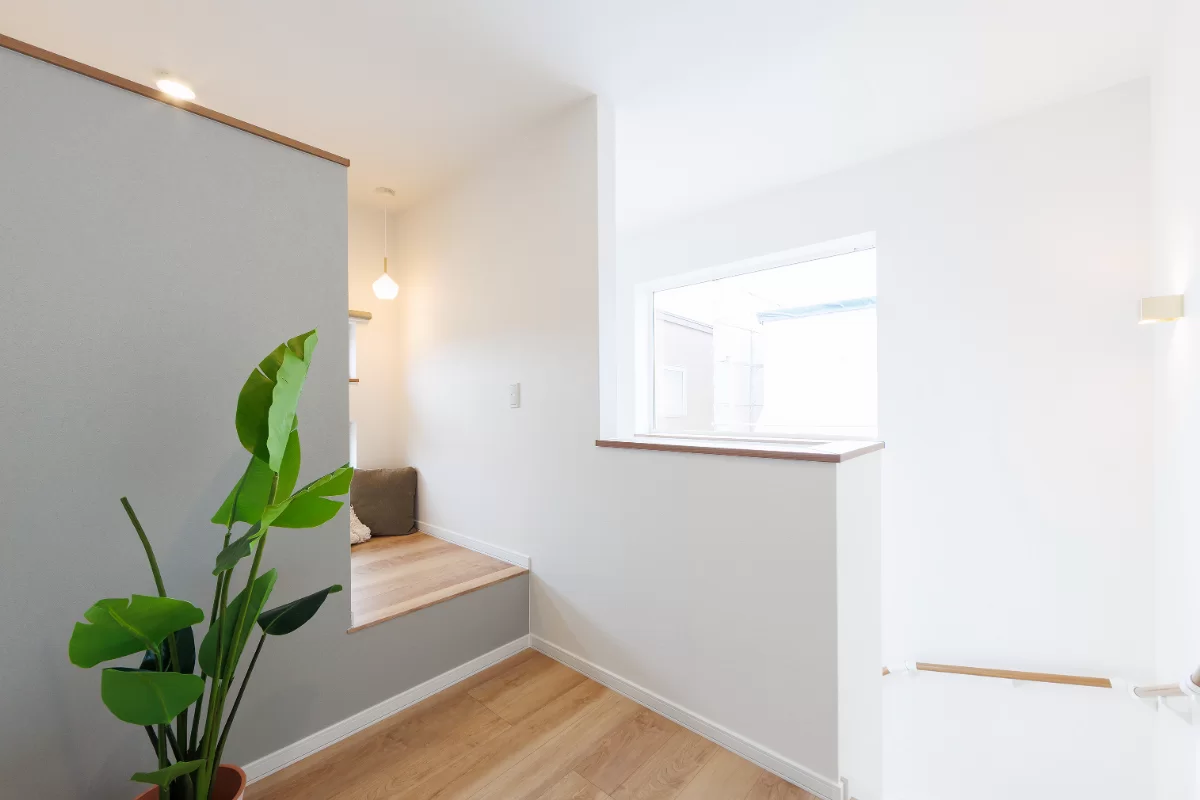 2階ホールに設けた小上がりは、腰壁でゆるやかに仕切られたくつろぎ空間。読書やお昼寝を楽しみながら、ほどよいおこもり感に包まれる心地よいスペースです。