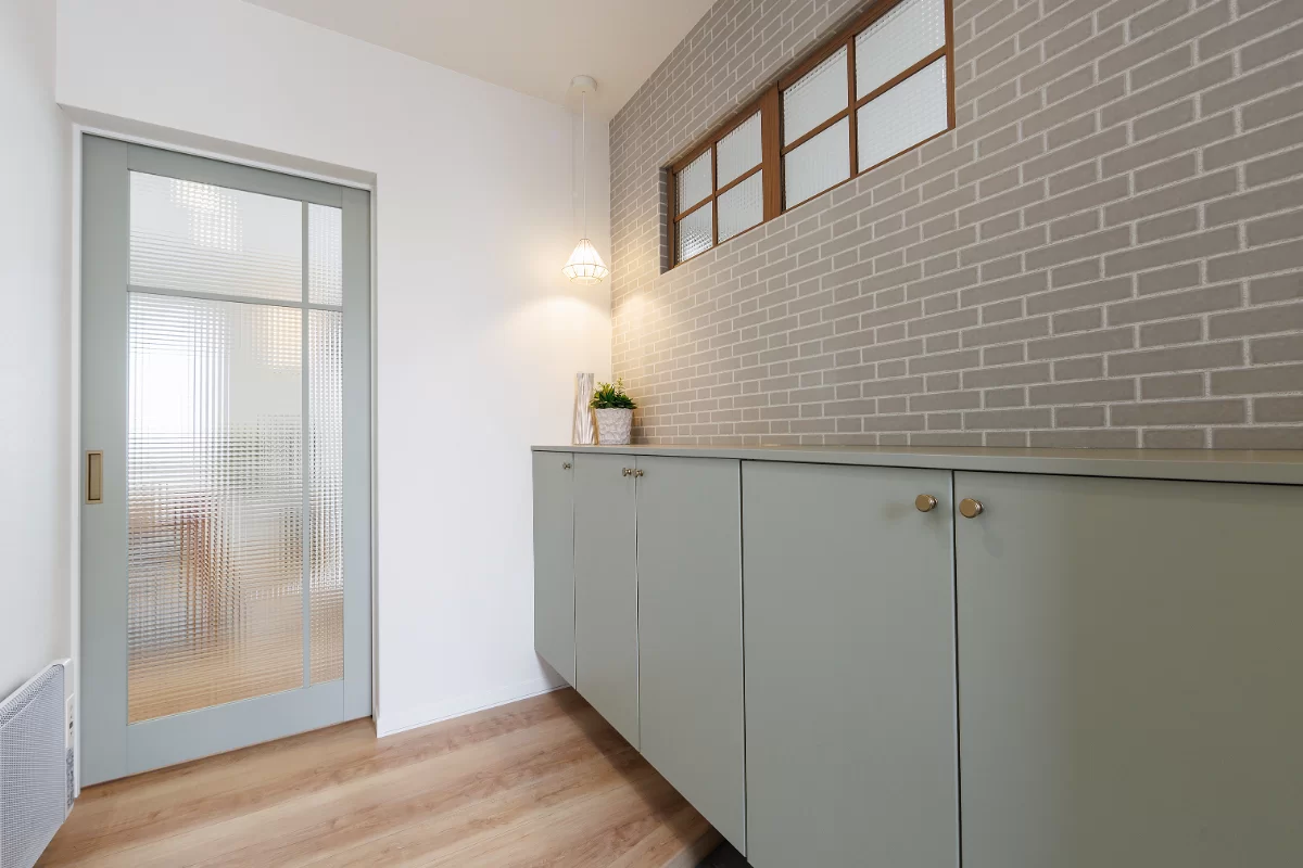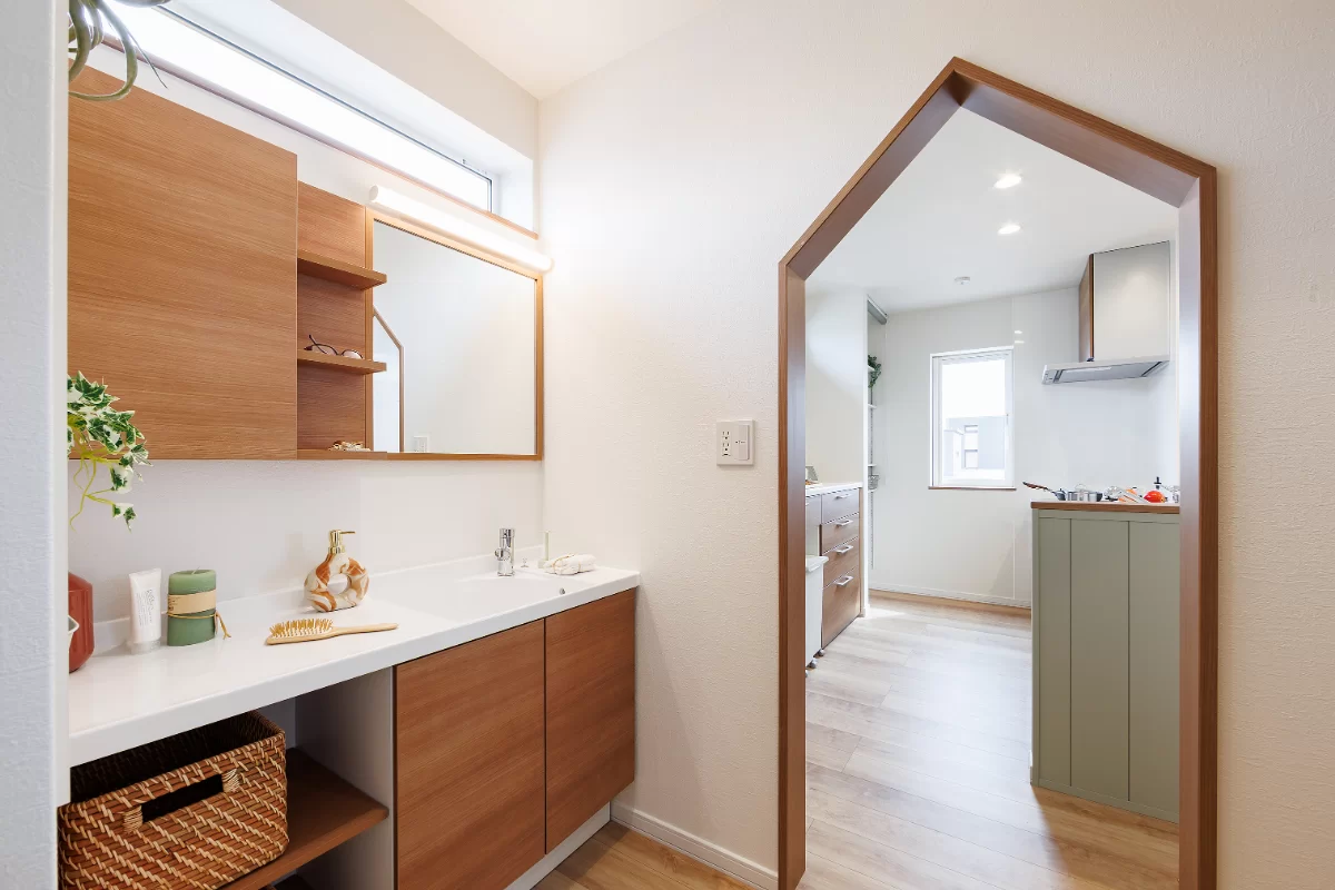洗面室の入口には三角の垂れ壁を採用し、さりげないデザインアクセントに。ゆったりサイズの洗面化粧台で朝の身支度も快適です。脱衣室と分けた設計で、来客時も気兼ねなく使えます。