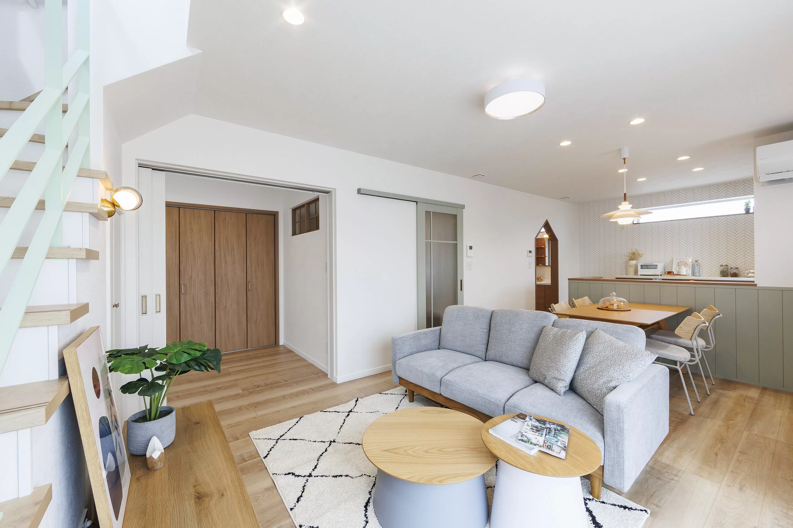 優しく温かみのある北欧ナチュラルテイストの住まい。吹き抜けと鉄骨手すりが視線の広がりをつくり、明るく開放的なリビングを演出します。