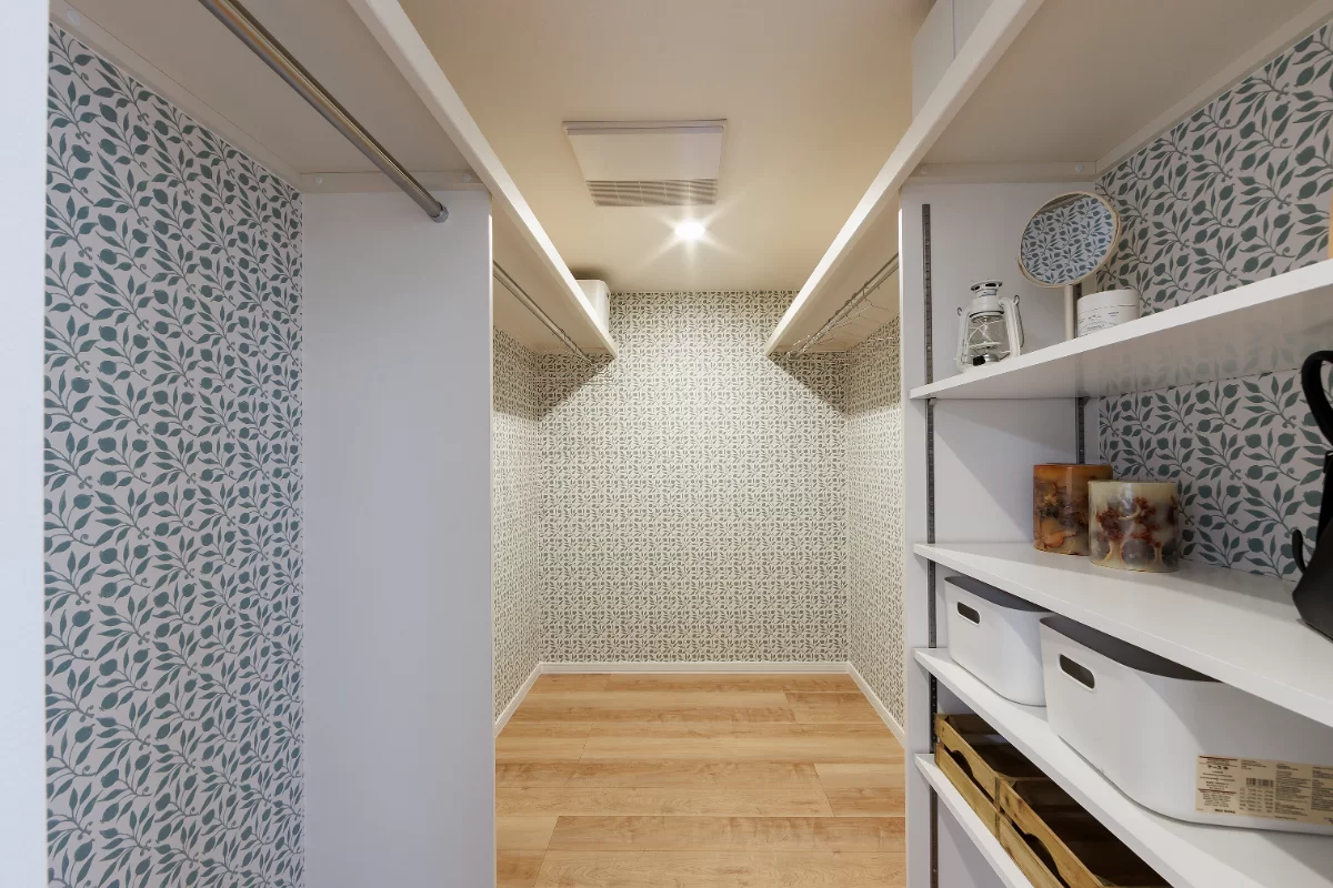 2階ホールには、各居室の収納とは別に、家族みんなで使えるファミリークローゼットを設けました。衣類や小物をまとめて収納でき、洗濯動線もスムーズになる間取りです。