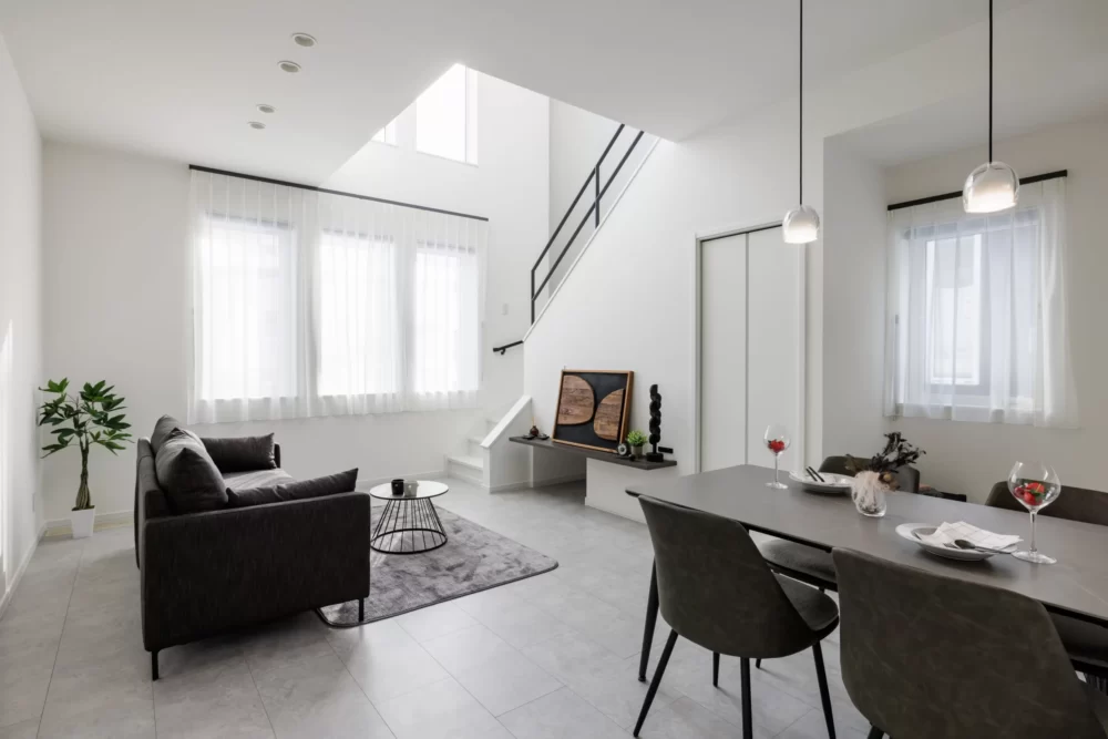 リビングは、階段をもうけた開放感のある吹抜けを採用しています。天井が高いことで家全体を広く見せることができ、明るく居心地のいい空間となっています。