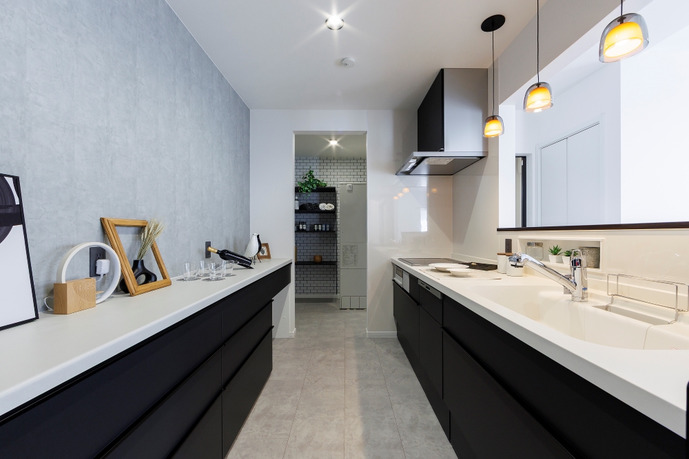 キッチンとユーティリティの両方から出入りできる収納は、食材や日用品のストックをまとめて管理することができます。