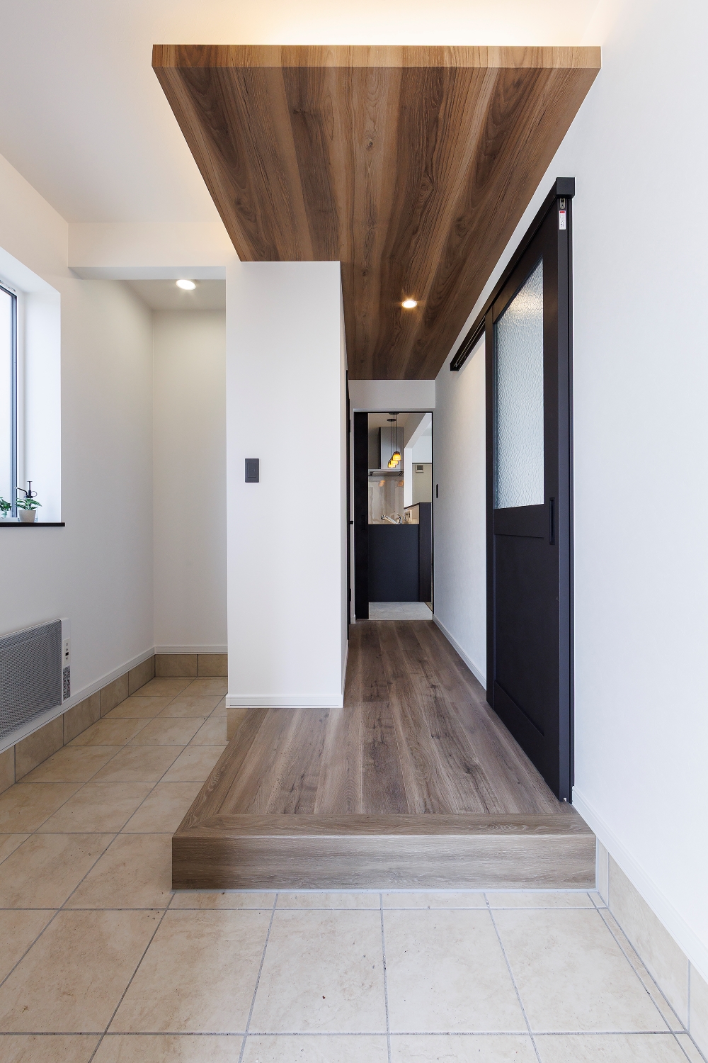 玄関からリビングを通る階段動線で、家族の気配を感じ自然と会話が生まれます。一部吹き抜けからやさしく光が照らし、隣の洋室とつなげればより広く伸びやかに使えます。