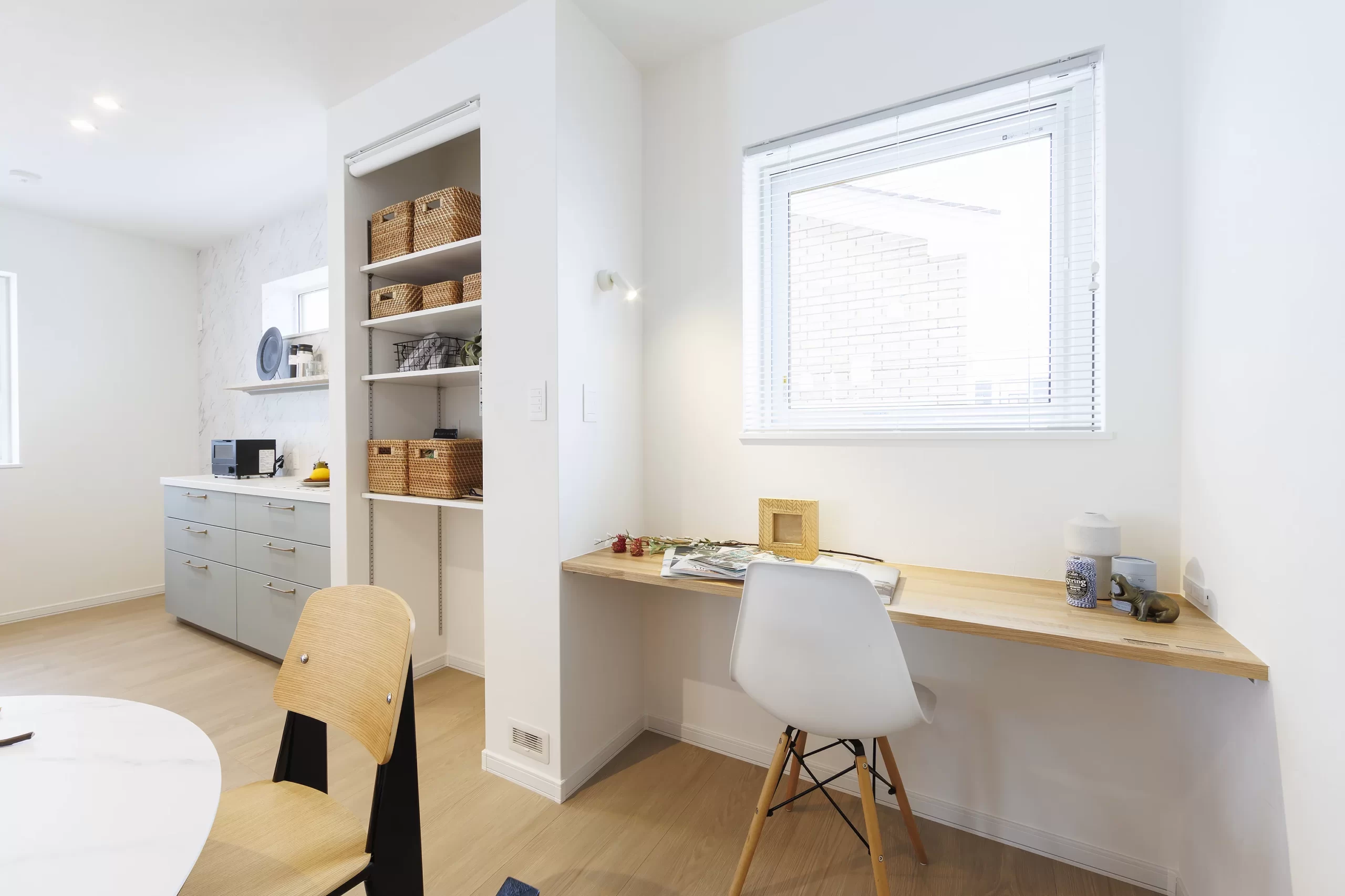 リビングには外の景色を眺めながら使えるカウンターを設置。お子さまの勉強や家事のひと休みにちょうどよく、作業がしやすい心地よいスペースです。