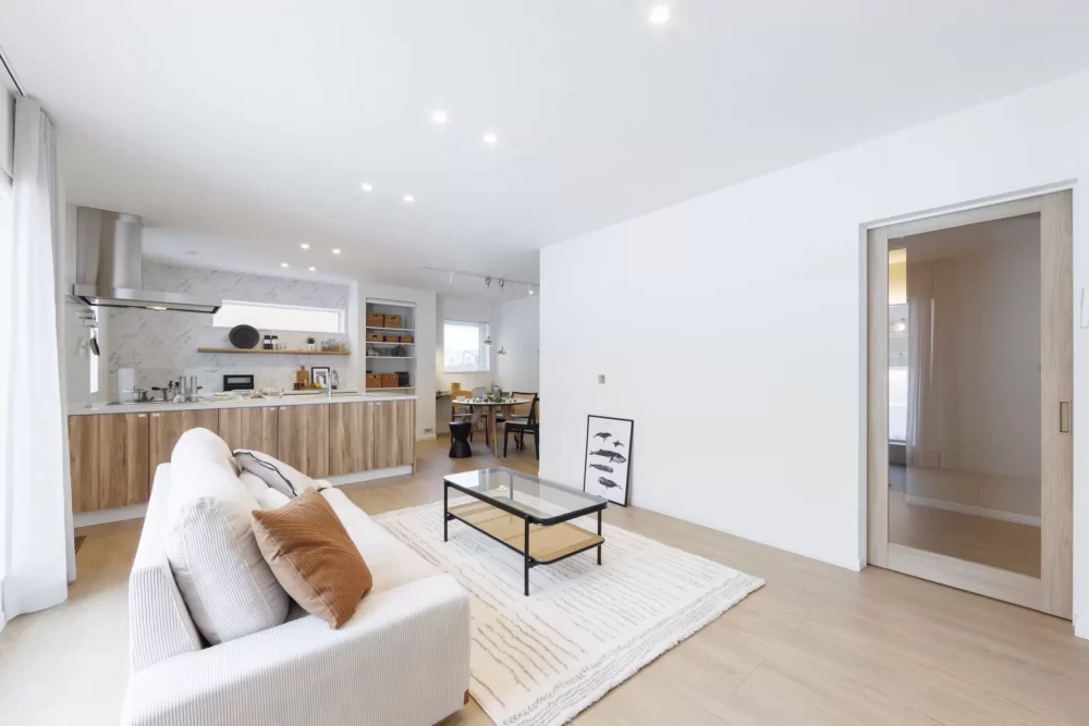 明るいナチュラルカラーのLDKは、どんなインテリアもマッチ。平屋ならではの動線と空間のつながりが心地よく、どんなインテリアにもなじむ明るく落ち着いたLDKです。