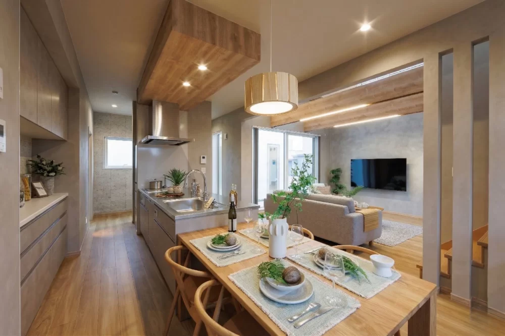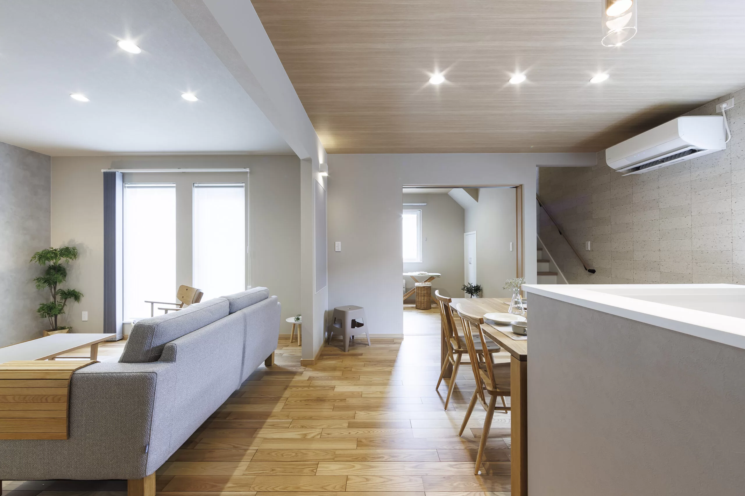 LDK全体で、家族が集まってもゆったり過ごせる広さが確保されています。リビングとホールをつなぐ扉にはハイドアを使用。開けた際の視界が広がり、実際の広さ以上の開放感を感じられます。
