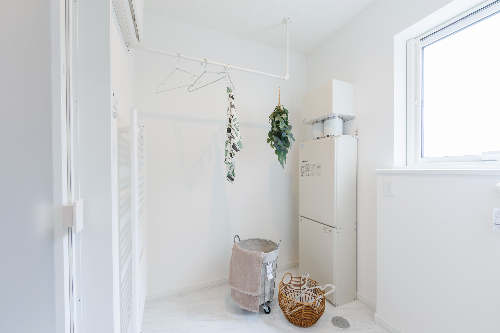 広々としたユーティリティには、洗濯物干しパイプ付きで「洗う→干す」がスムーズに完結。棚を置けば日用品の整理やアイロンがけもでき、毎日の家事を快適にこなせます。