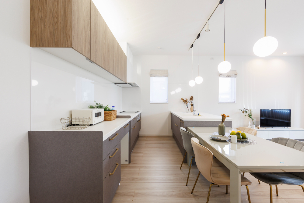 対面式キッチンは、料理をしながらリビングやダイニングを見渡せる設計。背面収納には間接照明を設置し、やわらかな光が日常を特別にしてくれます。大容量パントリー付きで、収納力も抜群です。