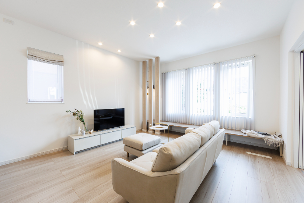 リビングはハイスタッドの高天井で開放感を演出。ナチュラルな色合いとシンプルなデザインが魅力のジャパンディスタイルで、落ち着きと温もりを感じる上質な空間に仕上げています。