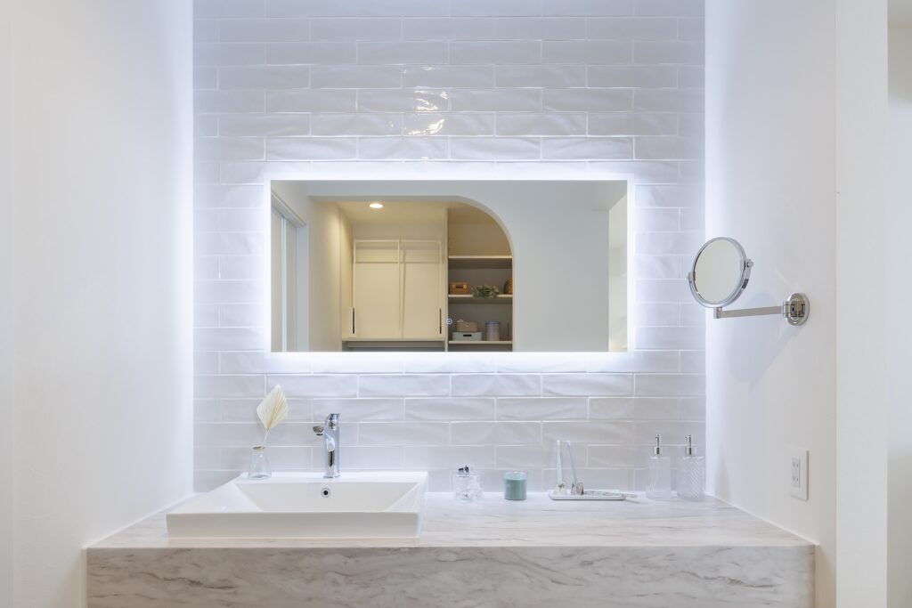 洗面台はアイカ工業製で、上質な質感とデザイン性を兼ね備えた造作風デザイン。幅170cmのゆとりある設計で、朝の忙しい時間も快適に身支度できます。