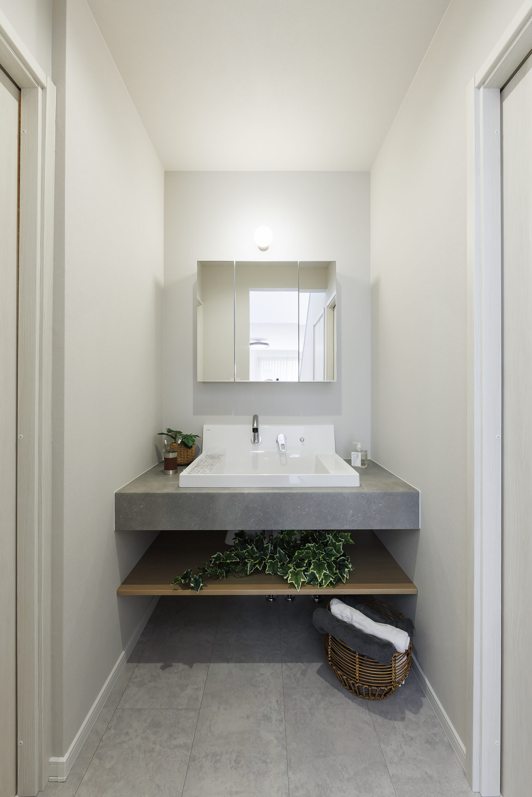 洗面台には大型のモルタル調ミラーを採用。シンプルなデザインながら高級感があり、上質で洗練された空間を演出します。