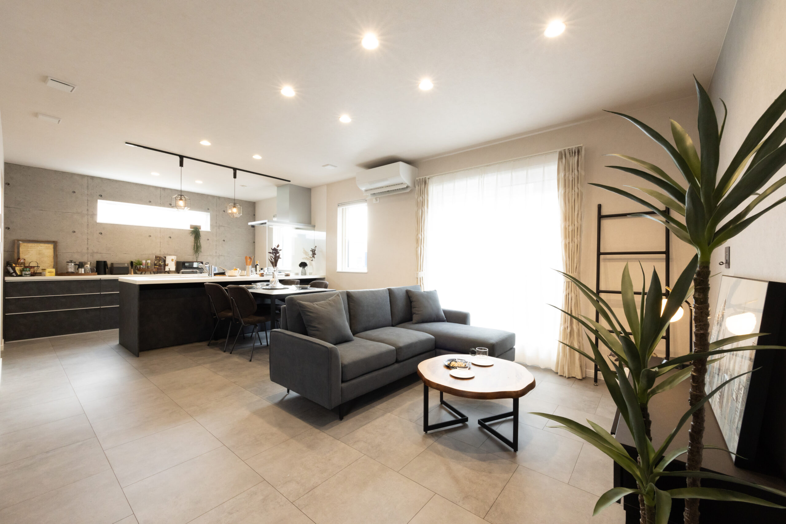 20帖の広々LDKは、ブラックを基調とした落ち着いた大人モダンスタイル。大容量のパントリーを備え、デザイン性と機能性を両立しています。