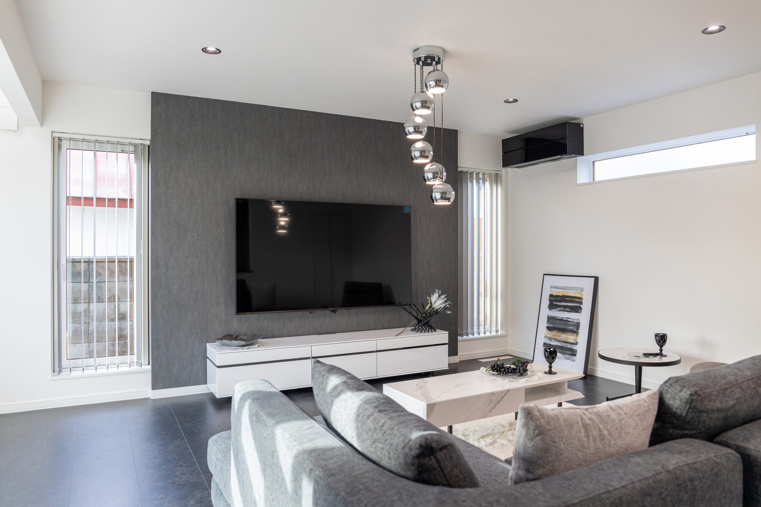 白と黒を基調にしたシンプルモダンなLDK。約20帖の広々空間で、ふかし壁にテレビを設置することで、すっきりしつつ立体感を演出。洗練された空間が広がります。