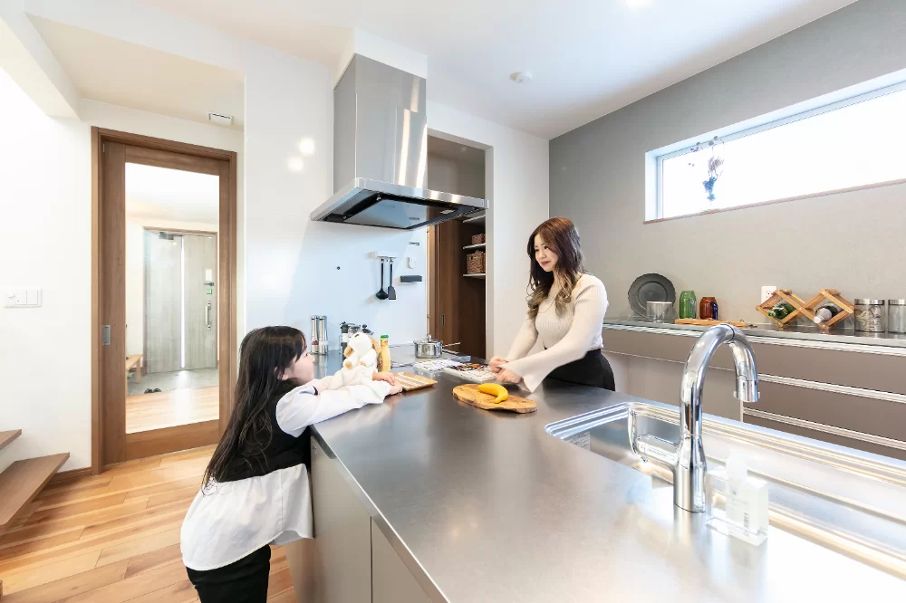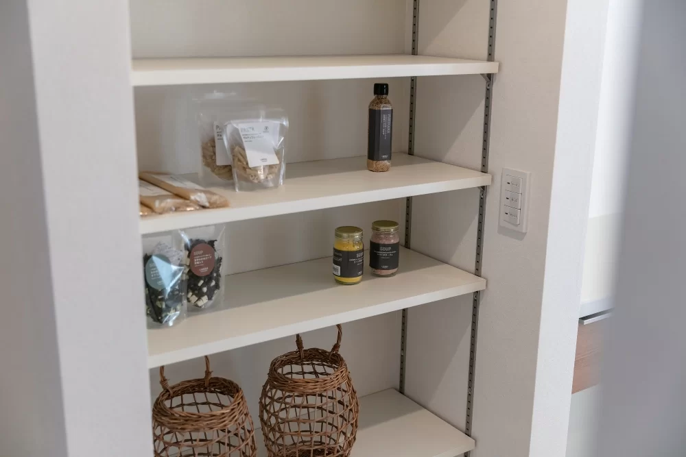 キッチンには便利なパントリーを設けており、食品や日用品のストックもすっきり収納。日々の家事もスムーズにキッチンまわりをいつでもきれいに保てます。