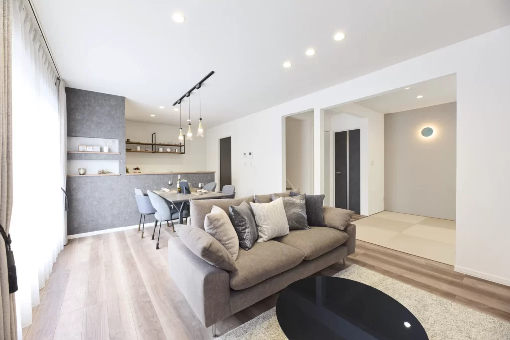 ジャパンディスタイルで統一したLDKは、隣接する洋室に2面開口を設け、空間に広がりと抜け感を演出。床材には上質な素材を採用し、木目の美しさが際立つ、落ち着きと洗練を感じる住まいに仕上げました。
