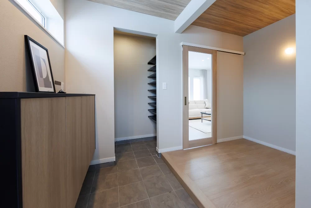 玄関横の広々としたシューズクロークは、ステンパイプ付きで濡れた上着も掛けられ、靴やコートの整理も簡単。玄関まわりをすっきり整えられる便利な空間です。