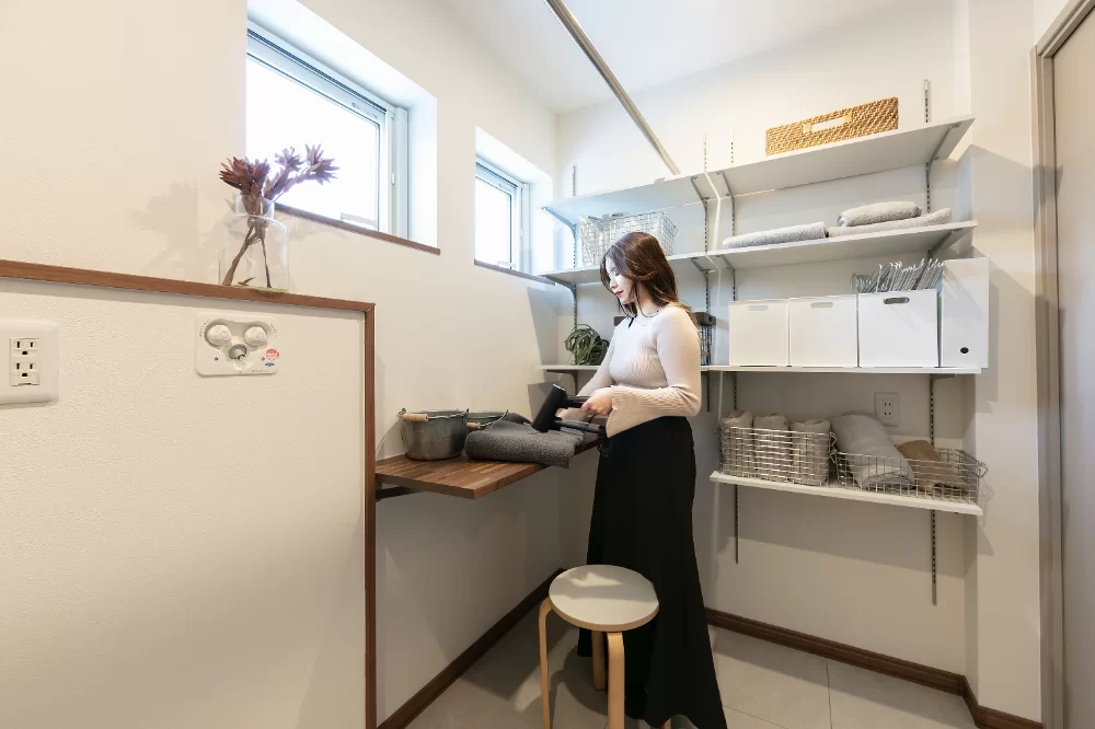 広々としたユーティリティーには洗濯後にそのまま干せるようハンギングバーを設置。洗面台と収納もついており日用品や洗剤もすっきり整理できます。