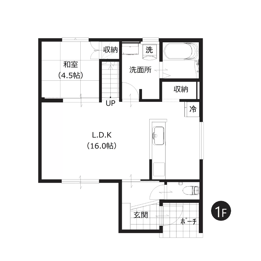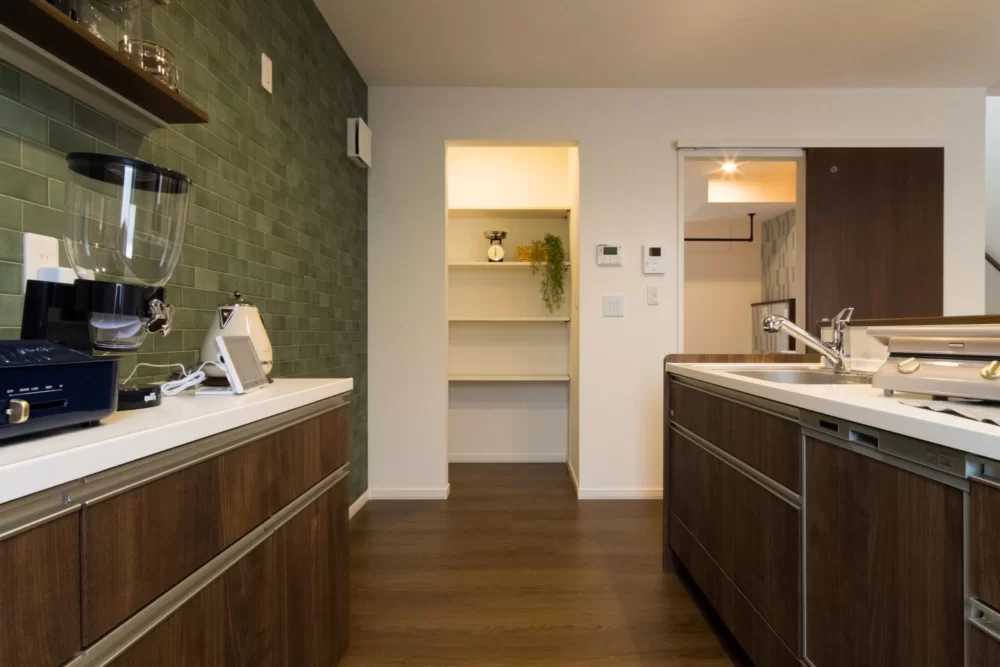 リビング・ダイニングを見渡せるキッチンは、家族と会話を楽しみながら心地よく家事が進みます。パントリーを備え、食材やストックもまとめて収納できます。 見た目の美しさと使いやすさを両立したキッチンです。