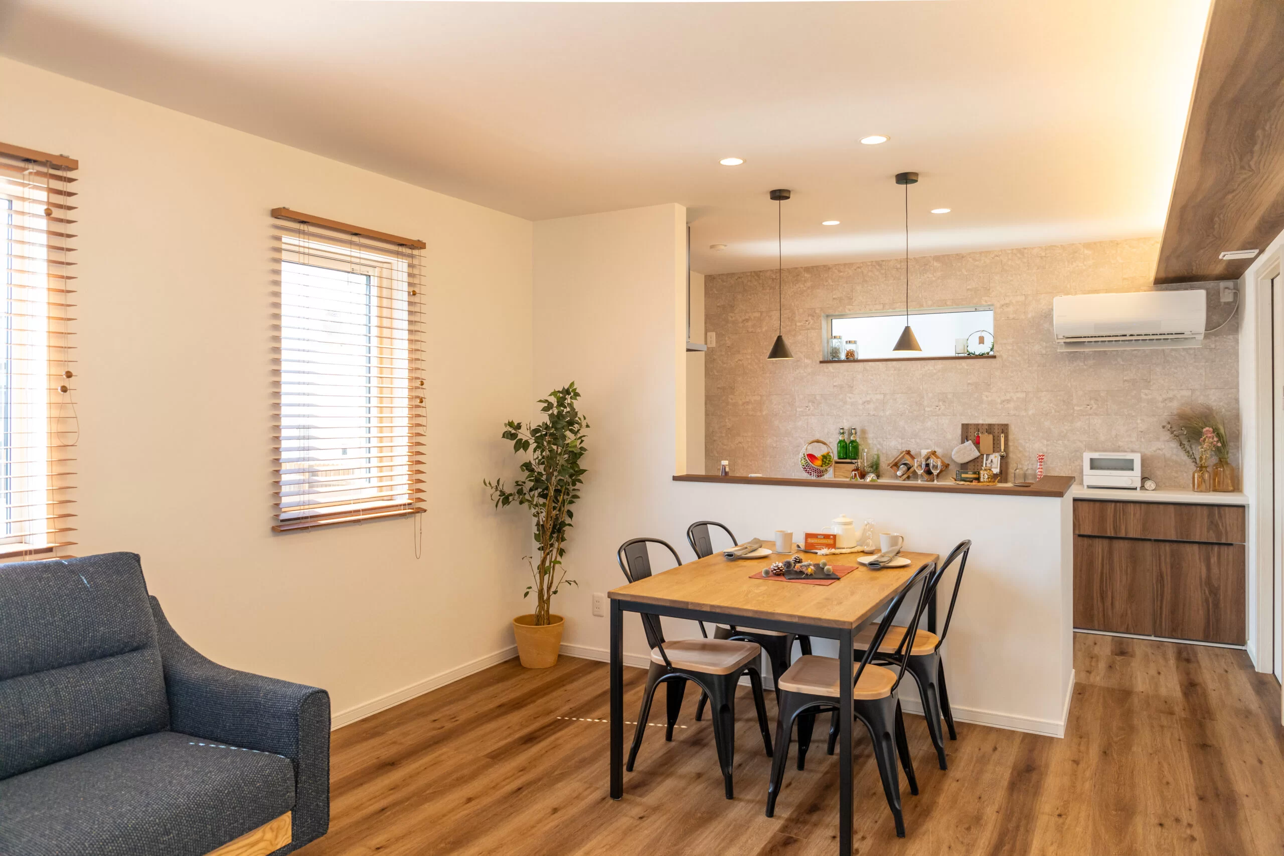 ナチュラルモダンのやさしい色合いで整えたLDKは、ダイニングとリビングがほどよい距離でつながり、家族の会話が自然と広がります。隣接する和室と合わせることで、空間にさらなるゆとりも。 くつろぎとつながりを大切にした住まいです。